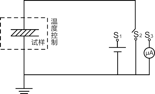 对于热刺激去极化电流(TSDC)的测量,首先利用温度控制将试样升温到某一温度,然后合上开关S1,再对试样加电压于一点时间后,保持电压不变,将试样温度急剧降至低温,然后打开S1,合上S2,再转向S3,以一定的升温速率升温。在升温开始时,由于试样温度很低,介质的去极化几乎不能发生,故电路里没有电流流过。随着温度升高,去极化逐渐开始,电路里产生电流,当温度升至某一点时,去极化全部完成,电路里电流随之为零。这一过程形成的电流就是热刺激去极化电流。